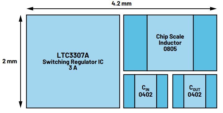 ??为了获得尽可能小的输出电容器和电感器尺寸,开关稳压器IC必须具有尽可能高的开关频率。输出电压的电压纹波基本上与外部元件的值和尺寸呈线性关系。例如,如果开关频率增加一倍,则实现相同输出电压纹波所需的电感值将减半。这样就可以减小设计尺寸。图2显示了 LTC3307A 开关稳压器的空间要求。由于开关频率高达3MHz,可以使用小的电感器。