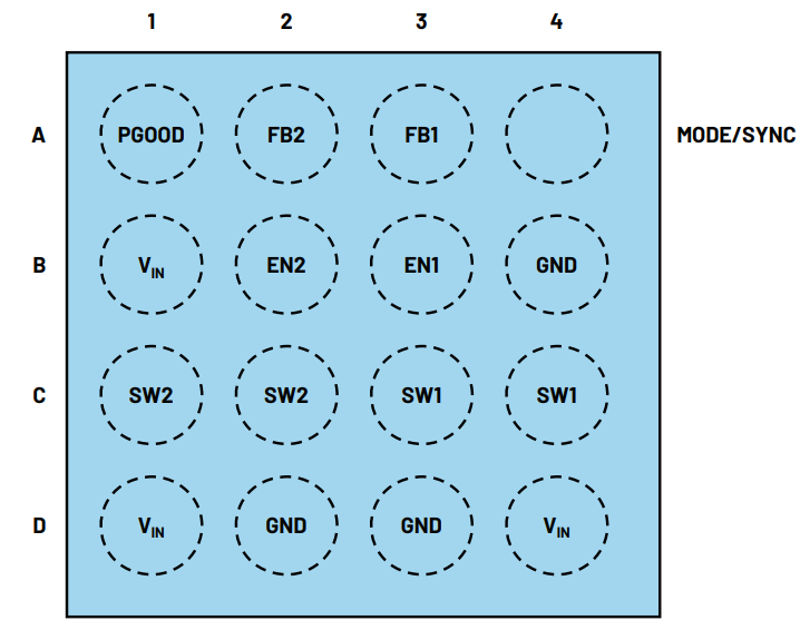 ??图4. 双降压稳压器IC的封装外形,尺寸为1.64 mm × 1.64 mm。