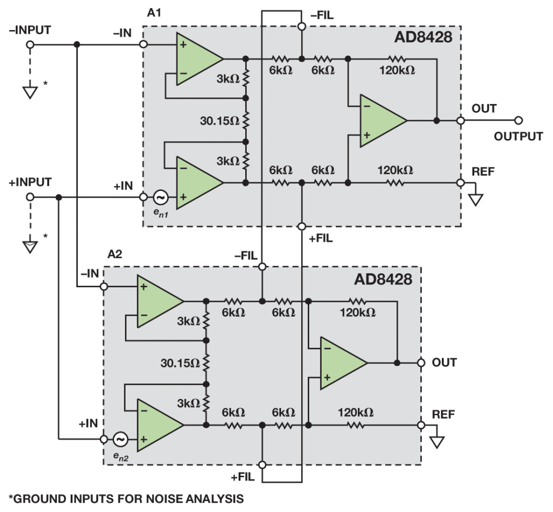 ??针对图2电路简化版本的分析表明,将两个AD8428以此方式连接可以降低噪声,降低的倍数为2。每一个AD8428的噪声都可以在+IN引脚上建模。为了确定总噪声,可以将输入接地,并使用叠加来组合噪声源。