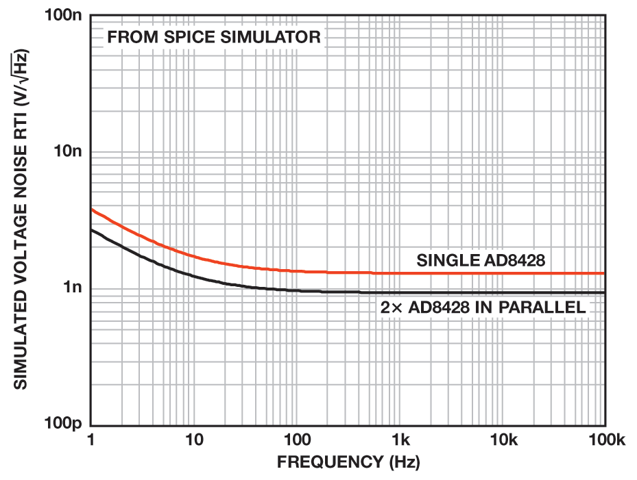 ??每一个AD8428 产生1.3 nV/ Hz折合到输入(RTI)的典型频谱噪声,该噪声与其他放大器产生的噪声不相关。不相关的噪声源以方和根(RSS)的方式叠加到滤波器引脚。另一方面,输入信号为正相关。每一个AD8428 都响应信号在滤波器引脚上生成相同的电压,因此连接多个AD8428 不会改变电压,增益保持为2000。