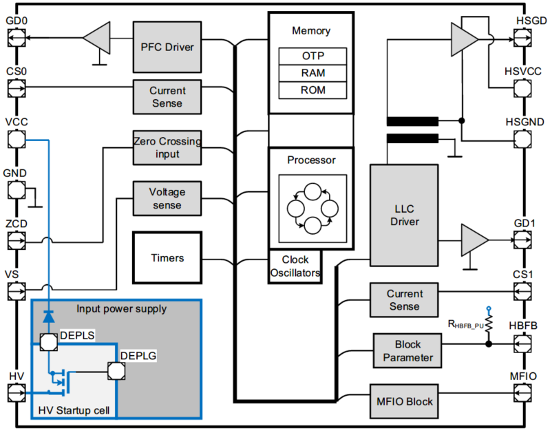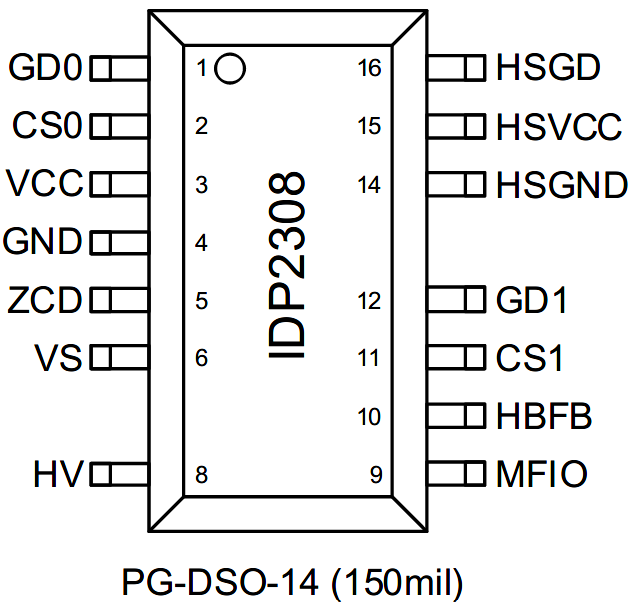 ??为了用户PCB布线方便,PFC相关管脚与LLC管脚分别放置于芯片两侧。左侧除Vcc、GND外,GD0、CS0、ZCD和VS均为PFC所需引脚。可以注意到,PFC部分并没有一般模拟控制器中的补偿相关引脚。这是因为IDP2308将一个2型补偿以数字的方式集成到了程序当中,P、I、T1以参数配置的形式提供给客户进行修改;除了省去外部补偿线路,这种形式另一个优点是:可以在系统的不同阶段对PIT1参数进行调整。比如:系统因为成本或空间限制选择较小的Vcc电容,在启动阶段可以选择更快速的PIT1组合使PFC母线快速达到目标,而稳态时又将环路带宽降低,从而满足包括整体系统的启动时间的要求;左侧还有一个HV高压启动引脚,IDP2308可以完成启动、AC检测(Brownin/out)以及X电容放电等功能;右侧包括LLC下管驱动GD1,电流采样CS1和高压侧的驱动信号。LLC的反馈引脚为HBFB;MFIO或者称为UART引脚,可完成参数的配置烧写、调试以及在故障状态下对外发出故障码,即所谓“黑匣子”功能。