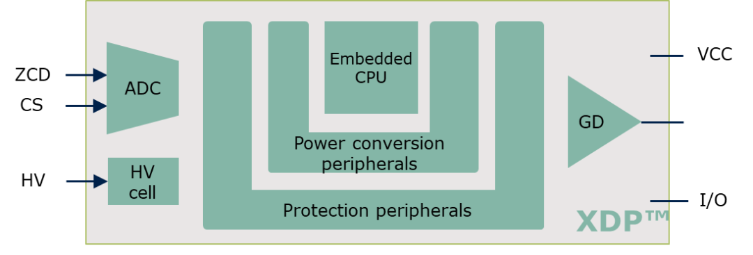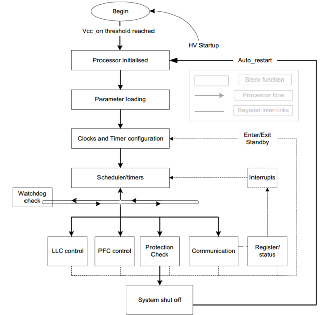 ??硬件方面,平台应具备硬件高集成的同时也应考虑拓扑延展的可能。英飞凌将高压侧驱动器(无铁芯变压器)、高压启动单元、以及自主研制的nanoDSP全部集成在一个DSO-16的窄体封装内,为电源产品的小型化提供了可能。高压启动单元可以完成启动、待机、输入的检测和X电容放电等功能;高压侧驱动可以让平台构建出桥式拓扑,比如半桥或高压Buck;nanoDSP除了本身的DSP单元外,还包括了电源管理线路(电源轨的存在才能够在待机时对某些功能单元关闭达到降低损耗的效果),低压侧驱动线路,硬件保护线路,ESD线路以及许多专用功能的硬件模块(专用的硬件可避免消耗DSP本身的算力而达到更为高效的目的)。有些功能很有趣,比如驱动电平及驱动电流可以通过配置寄存器改变。
