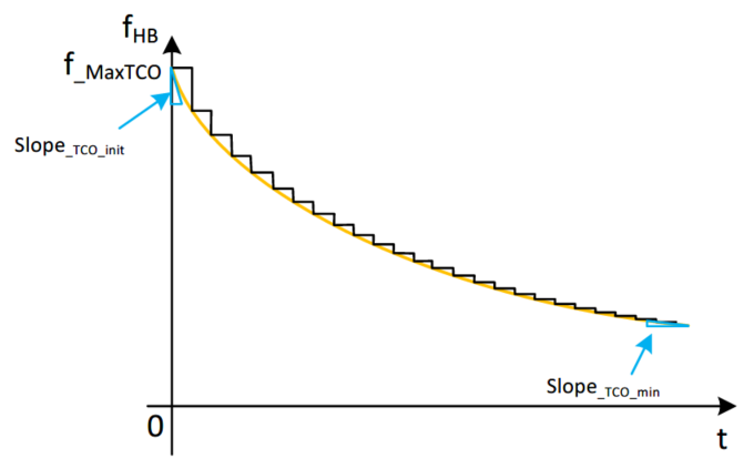 ??关于启动,一方面需要关心输出电压的形态(过冲?负斜率?)还需要关心启动时间以及系统中的电压电流应力。我们知道LLC启动时励磁电感和谐振电容电压都为零,为了避免高电流应力和容性状态所以普遍需要采用高频启动,这个过程通常是开环完成的。这里用到了一个频率曲线TCO,频率随时间变化而变低;但是随时间怎样变化呢?多长时间变化多少呢?