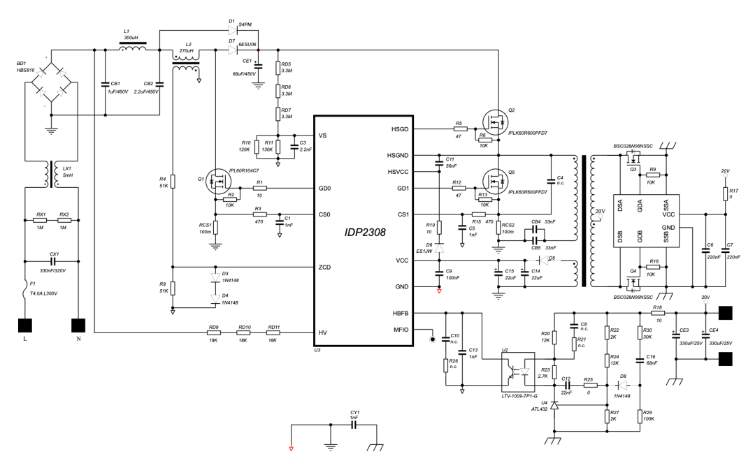 ??显然,不同的结构和控制算法会衍生出不同的产品。对于中小功率市场,考虑到功率因数及谐波要求,需要加入PFC环节。由于功率范围不大,同时综合成本,临界模式PFC是一种不错的选择。LLC因为其全负载范围内具备的软开关特性,宽增益范围以及窄频工作特点已被行业广泛采用,我们主功率环节采用LLC。这个产品就是针对中小功率开关电源控制器:IDP2308
